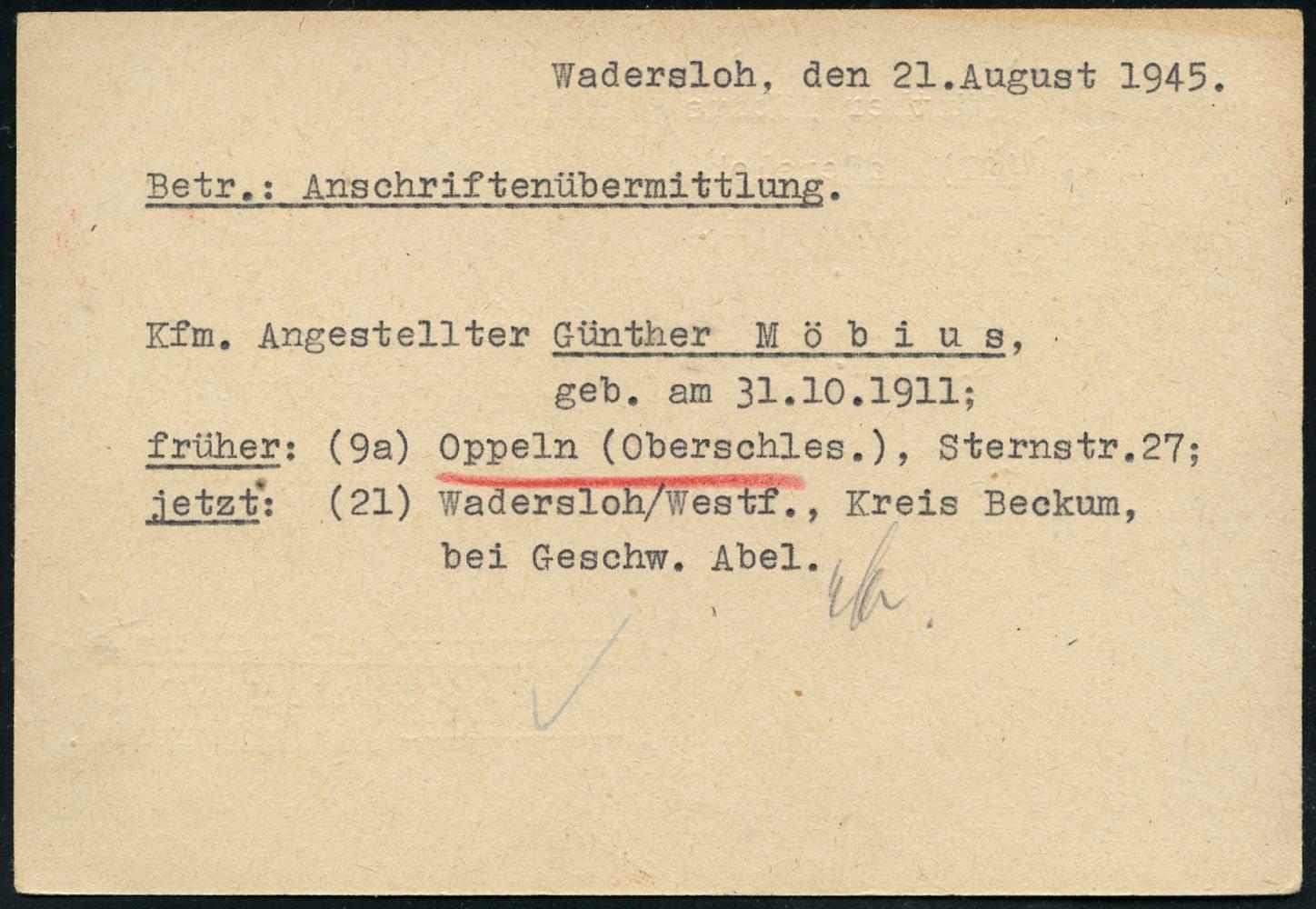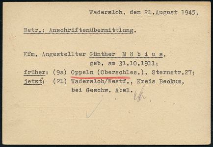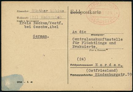 8325 | 18 € | PL-Raum 47.. (ohne Hamm) : LIPPSTADT/ **/ Gebühr bezahlt 1945 (21.8.) roter Doppeloval.PFS auf Dienst-Kt. (links unten Fleck) an die Centralauskunftsstelle für Flüchtlinge u. Evakuierte in Norden zu eiem Bürger aus Oppeln, früher Nachkriegsbeleg, Zeitgeschichte! (Dü.A-5, Nr.20) | ![]() ![]() | |