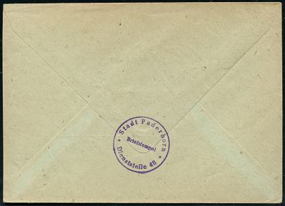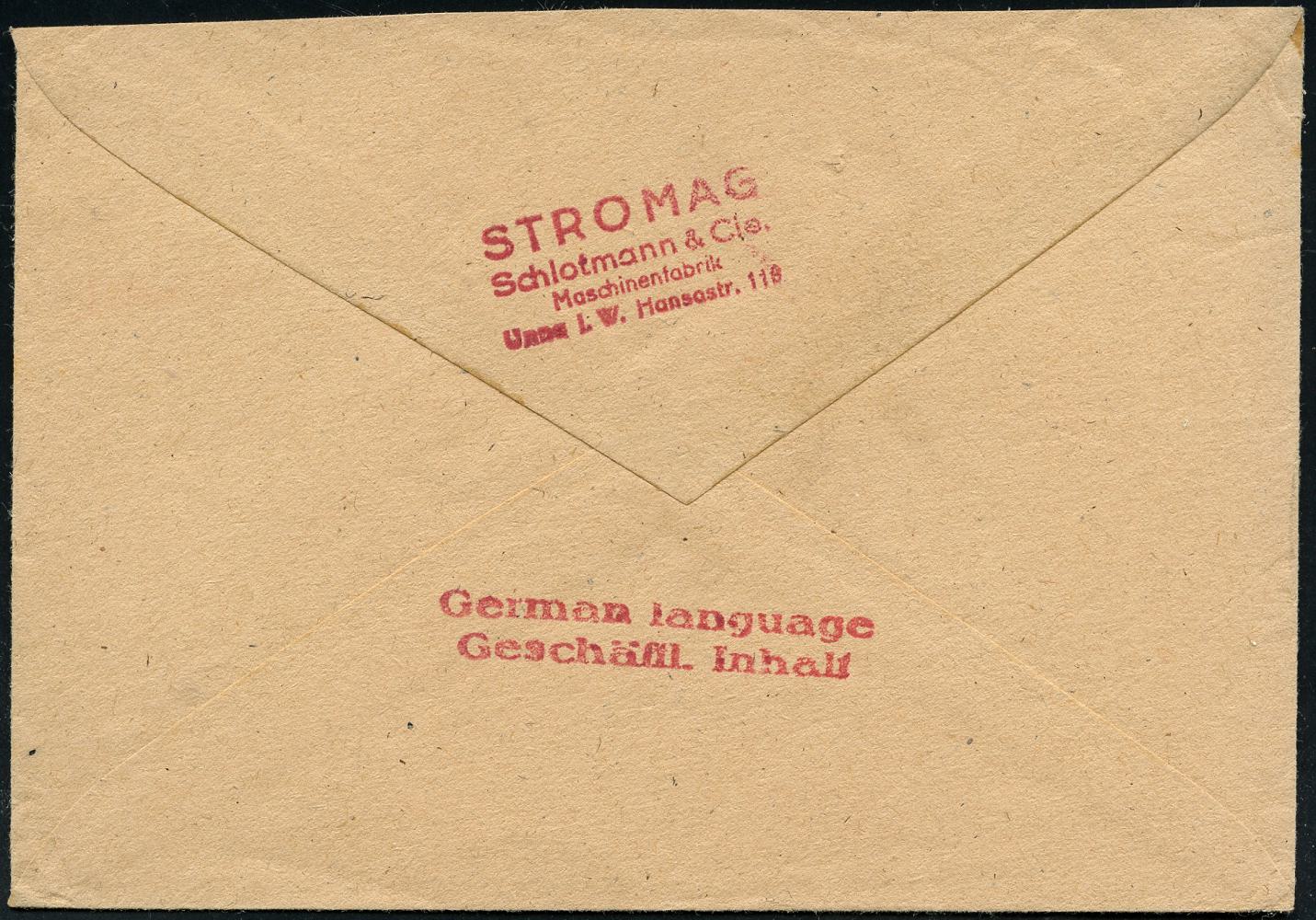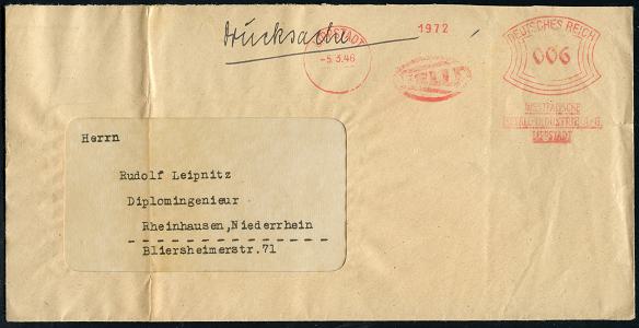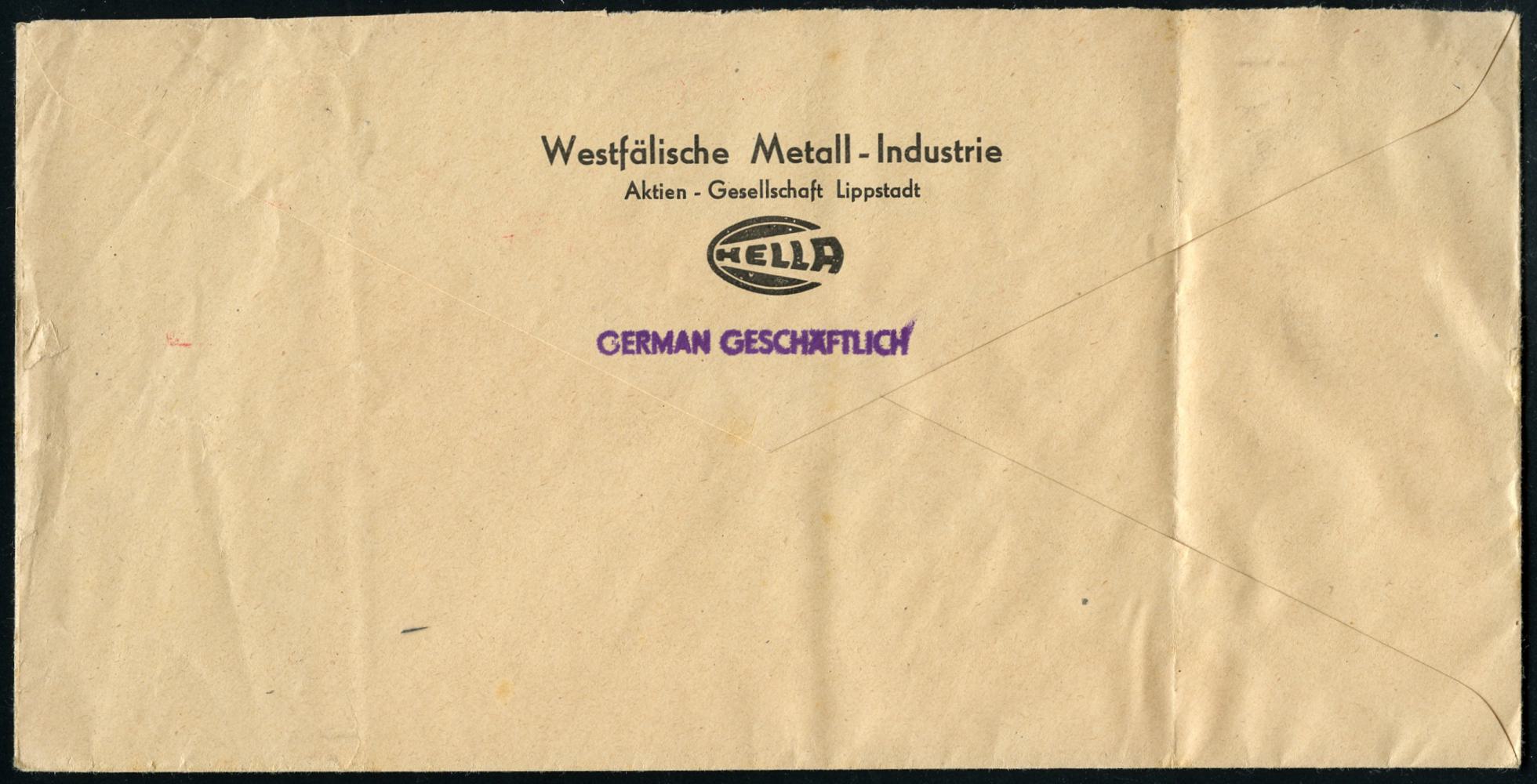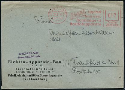 8328 | 20 € | PL-Raum 47.. (ohne Hamm) : LIPPSTADT/ HELLA/ WESTFÄL./ METALL-INDUSTRIE AG:: 1946 (5.3.) AFS Francotyp "Bogenrechteck" unverändert weiterverwendet mit Inschrift "DEUTSCHES REICH" = Notmaßnahme! (Logo) rs. motivgl. Abs.-Vordruck (auch Hersteller von Kfz.-, Motorrad- u. Fahrrad-Leuchten) Fern-Bf. (links gefaltet) (Dü.E-1BAh, unverändert) | ![]() ![]() | |