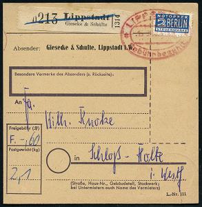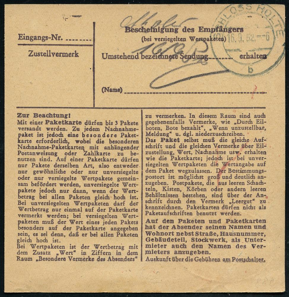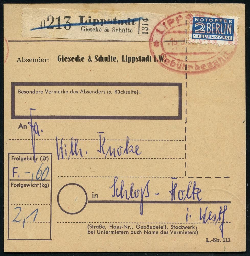8329 | 18 € | PL-Raum 47.. (ohne Hamm) : LIPPSTADT/ **/ Gebühr bezahlt 1952 (15.9.) Doppeloval-PFS auf 2 Pf. NoB + schw. Selbstbucher-Paketzettel: Lippstadt/ Gieseke & Schulte , Inl.-Selbstbucher-Paket-Kt. n. Schloß-Holte, rs. AS. (Dü.A-5, Nr.20) | ![]() ![]() | |