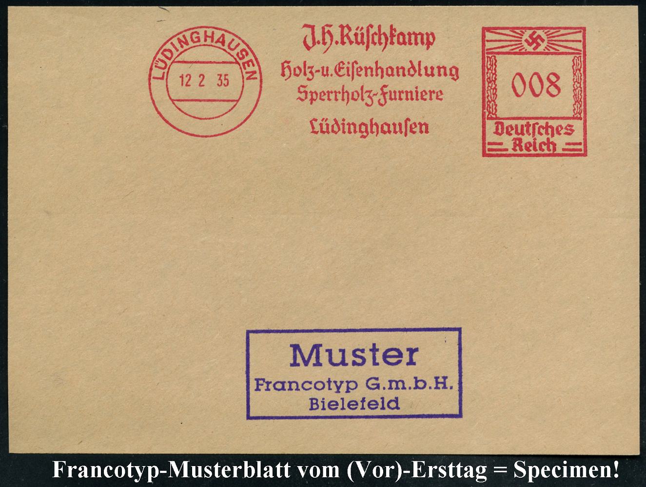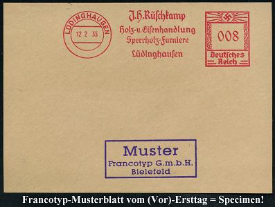 8332 | 35 € | PL-Raum 47.. (ohne Hamm) : LÜDINGHAUSEN/ J.H.Rüschkamp/ Holz-u.Eisenhandlung/ Sperrholz-Furniere.. 1935 (12.2.) AFS-Musterabdruck Francotyp "Hakenkreuz" , glasklar gest. Francotyp-Musterblatt vom (Vor)-Ersttag!, selten! (Dü.E-3CEo) | ![]() ![]() | |