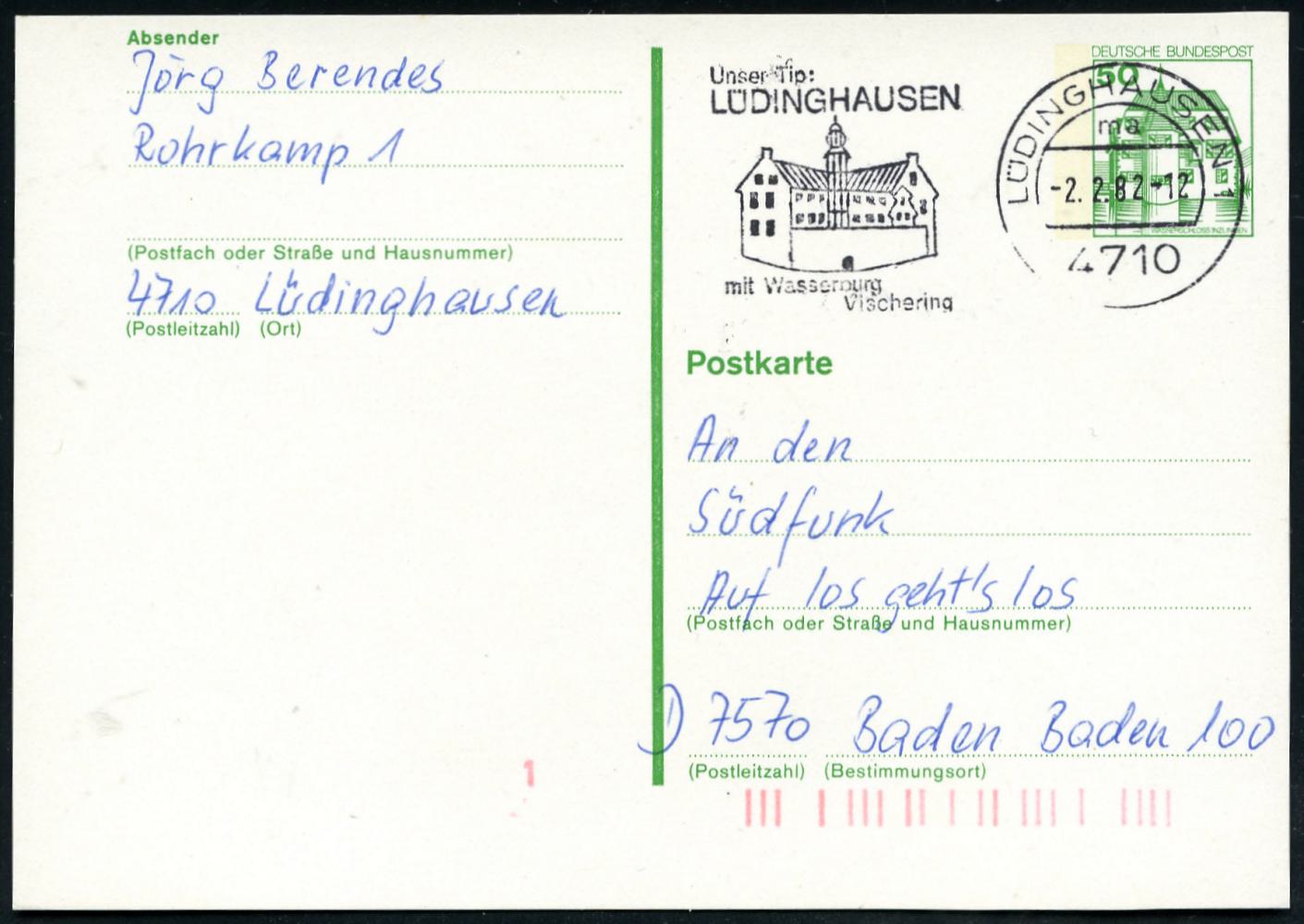 8333 | 5 € | PL-Raum 47.. (ohne Hamm) : 4710 LÜDINGHAUSEN 1/ ma/ Unser Tip:/ LÜDINGHAUSEN/ mit Wasserburg.. 1982 (2.2.) MWSt (Wasserburg) codierte Bedarfs-Kt. | ![]() | |