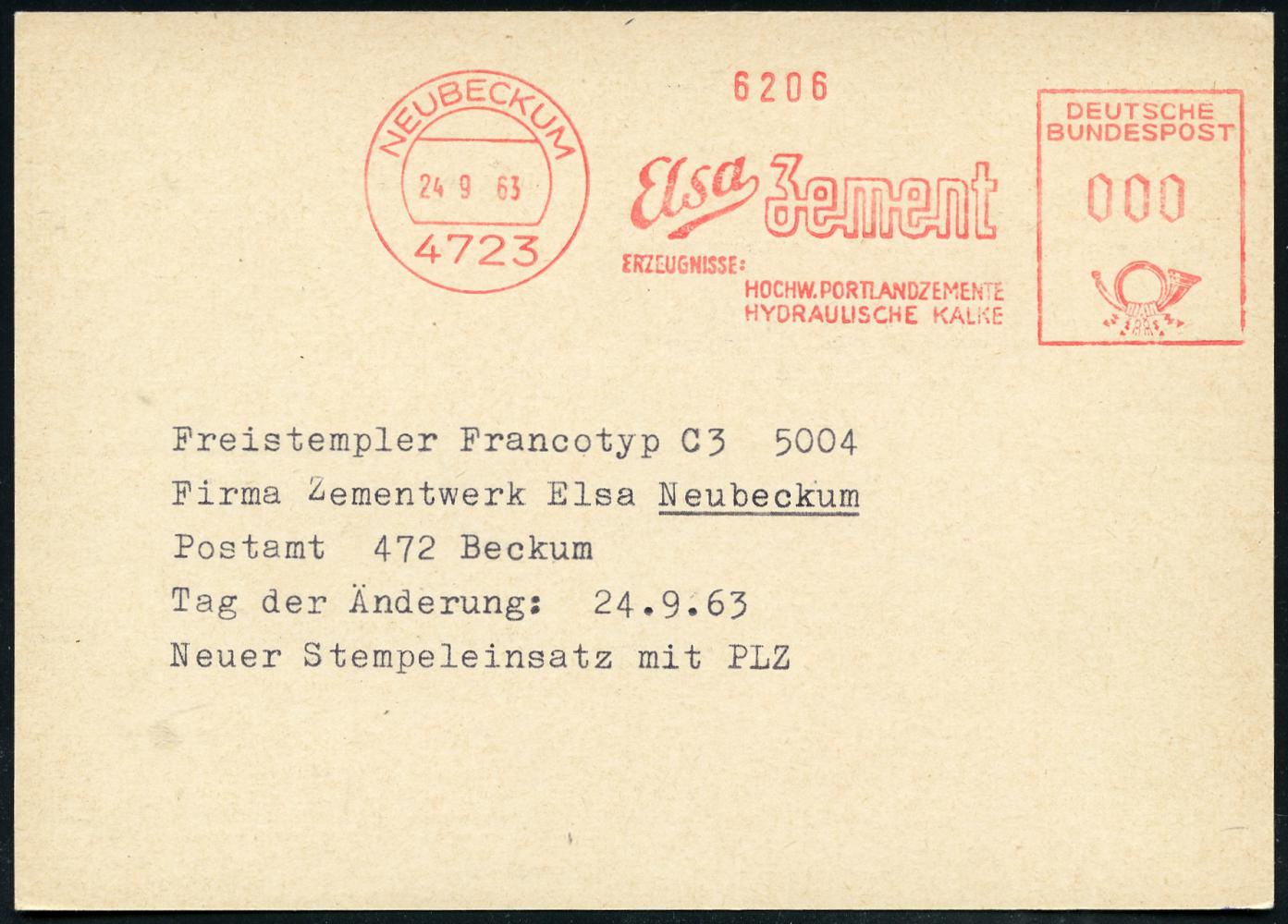 8335 | 20 € | PL-Raum 47.. (ohne Hamm) : 4723 NEUBECKUM/ Elsa Zement/ ERZEUGNISSE:/ HOCHW.PORTLANDZEMENT/ HYDRAULISCHE KALKE 1963 (24.9.) AFS Francotyp "Posthorn" auf Archivkarte des PA 472 Beckum (neuer Stpl.-Einsatz mit neuer PLZ) seltenes Unikat ! (Dü.E-23CGh) | ![]() | |