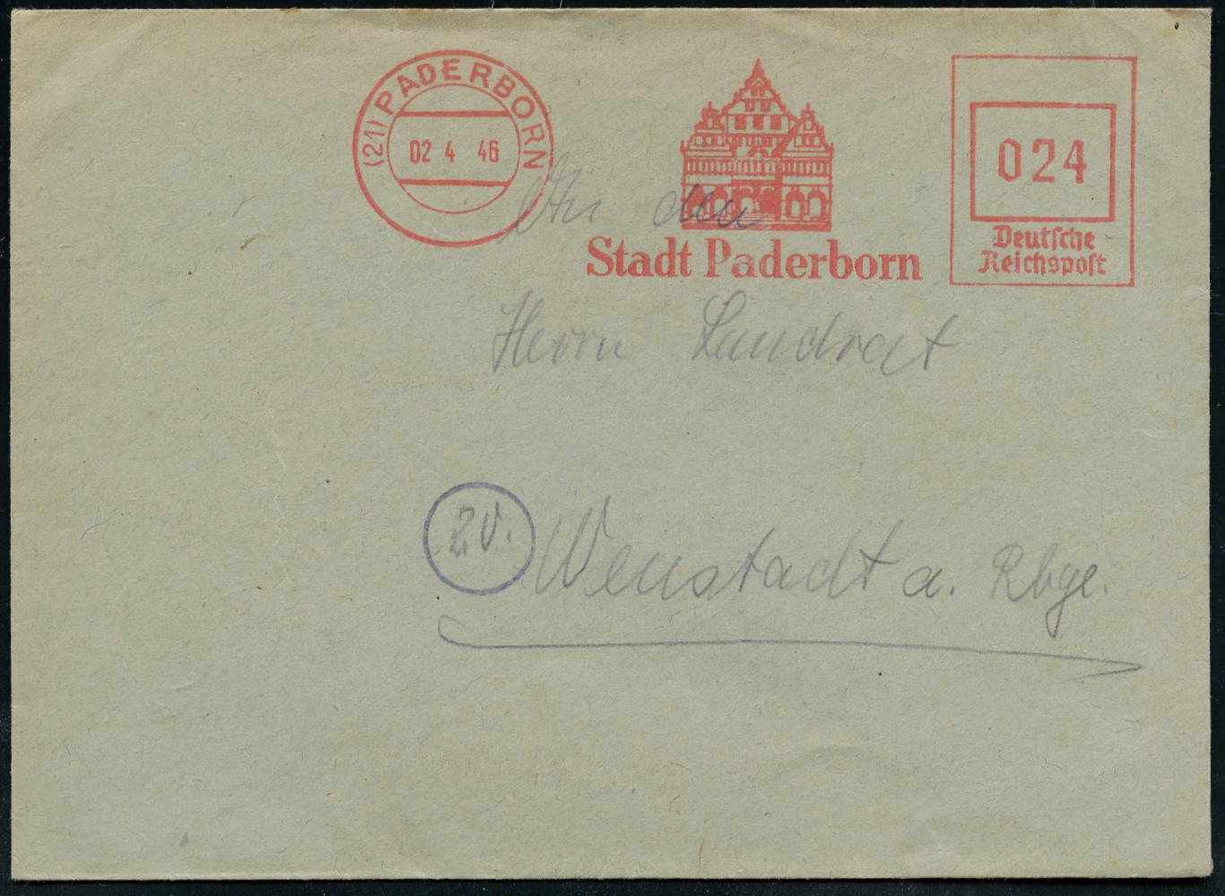 8344 | 23 € | PL-Raum 47.. (ohne Hamm) : (21) PADERBORN/ Stadt Paderborn 1946 (2.4.) aptierter AFS Francotyp "Reichsadler" = entfernt = Notmaßnahme! (histor. Altstadthäuser) rs. Abs.-Vordruck, Fern-Bf. (Dü.E-13 J-129o) | ![]() ![]() | |