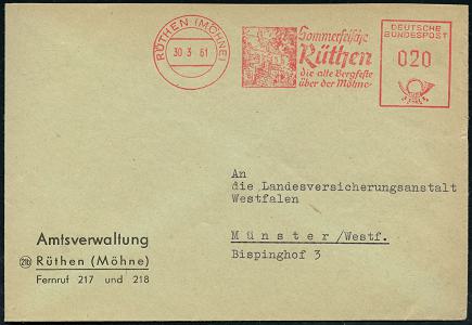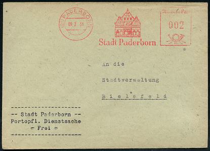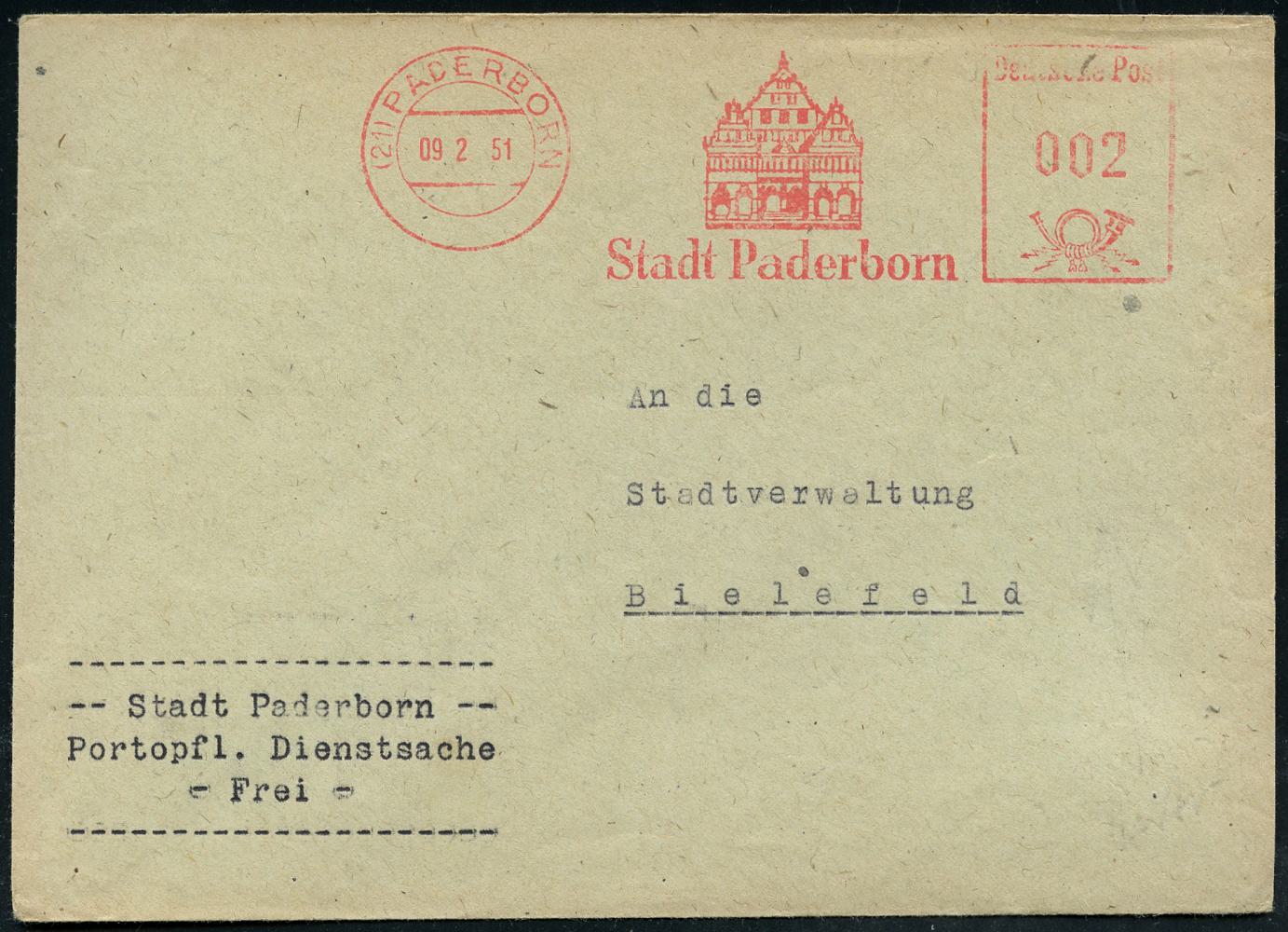 8347 | 18 € | PL-Raum 47.. (ohne Hamm) : (21) PADERBORN/ Stadt Paderborn 1951 (9.2.) AFS Francotyp "Posthorn" 002 Pf. (histor. Altstadt-Häuser) unterfrankierter Dienst-Bf.unbeanstandet ohne Nachgebühr (rs. Dienst-HdN) n. Bielefeld (Dü.E-20CGo = Letztjahr) | ![]() ![]() | |