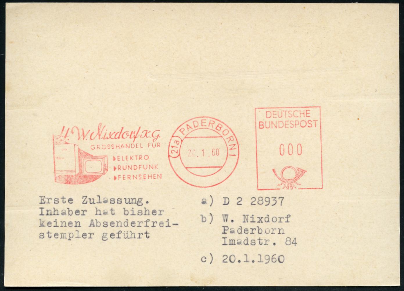 8348 | 20 € | PL-Raum 47.. (ohne Hamm) : (21a) PADERBORN 1/ W.Nixdorf KG/ GROSSHANDEL FÜR/ ELEKTRO/ RUNDFUNK/ FERNSEHEN 1960 (20.1.) AFS Postalia auf postamtl. Archivkarte (Kühlschrank, Fernseher) mit div. Vermerken: "Erste Zulassung.." vom Ersttag!, seltenes Unikat! (Dü.E-26 B) | ![]() | |