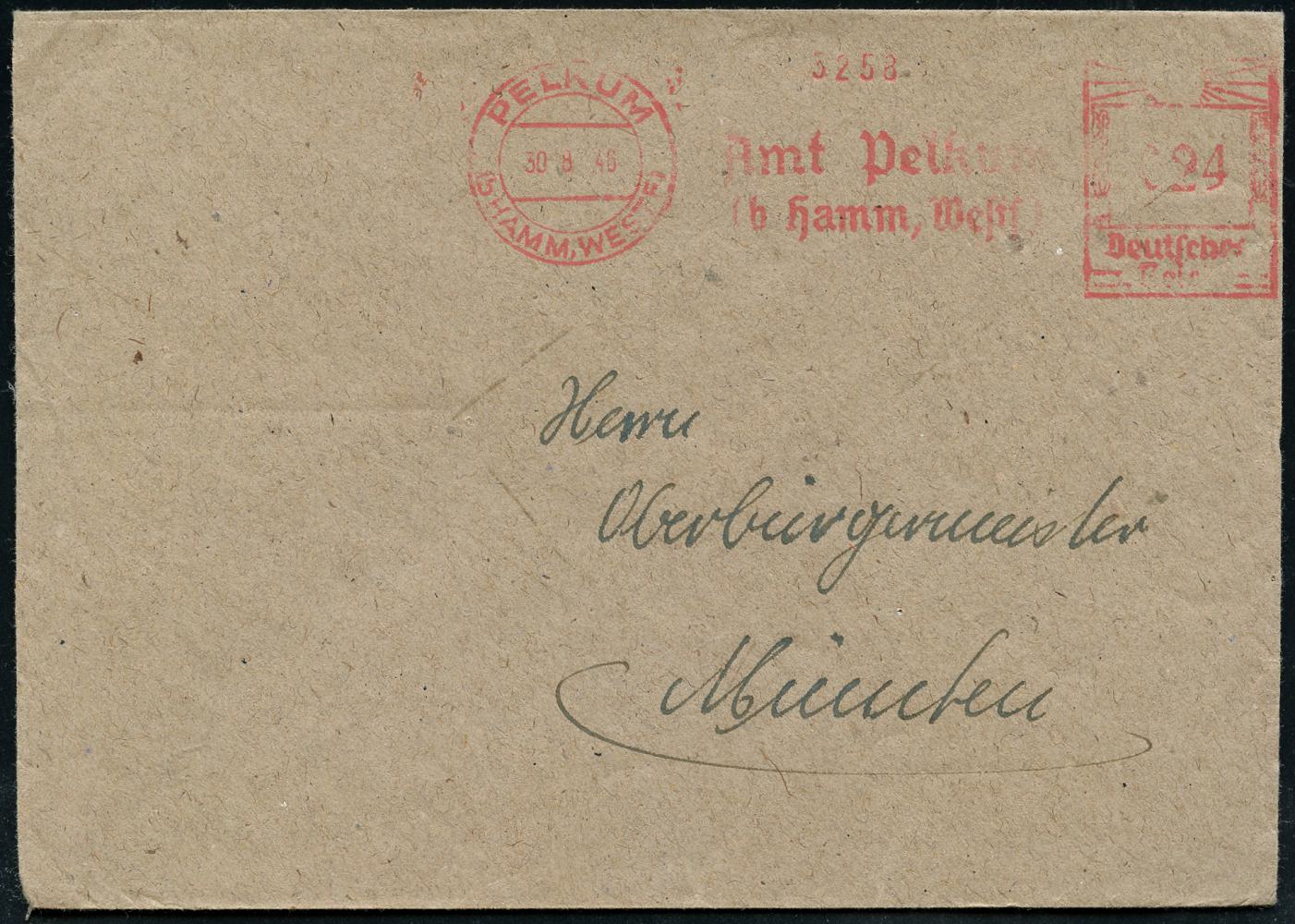 8358 | 30 € | PL-Raum 47.. (ohne Hamm) : PELKUM/ (b HAMM,WESTF)/ Amt Pelkum.. 1946 (30.8.) seltener, aptierter AFS Francotyp "Hakenkreuz" = entfernt = Notmaßnahme! , Kommunal-Bf. n. München (Dü.E-12 H-98h = seltene Type!) | ![]() | |