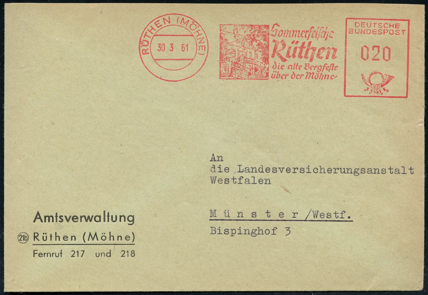 8360 | 12 € | PL-Raum 47.. (ohne Hamm) : RÜTHEN (MÖHNE)/ Sommerfrische/ Rüthen/ die alte Bergfeste.. 1961 (30.3.) AFS Francotyp (Schloßtreppe) Dienst-Bf.: Amtsverwaltung (21 b) Rüthen.. (Dü.E-23CGo) | ![]() | |