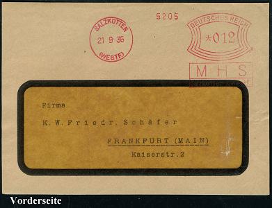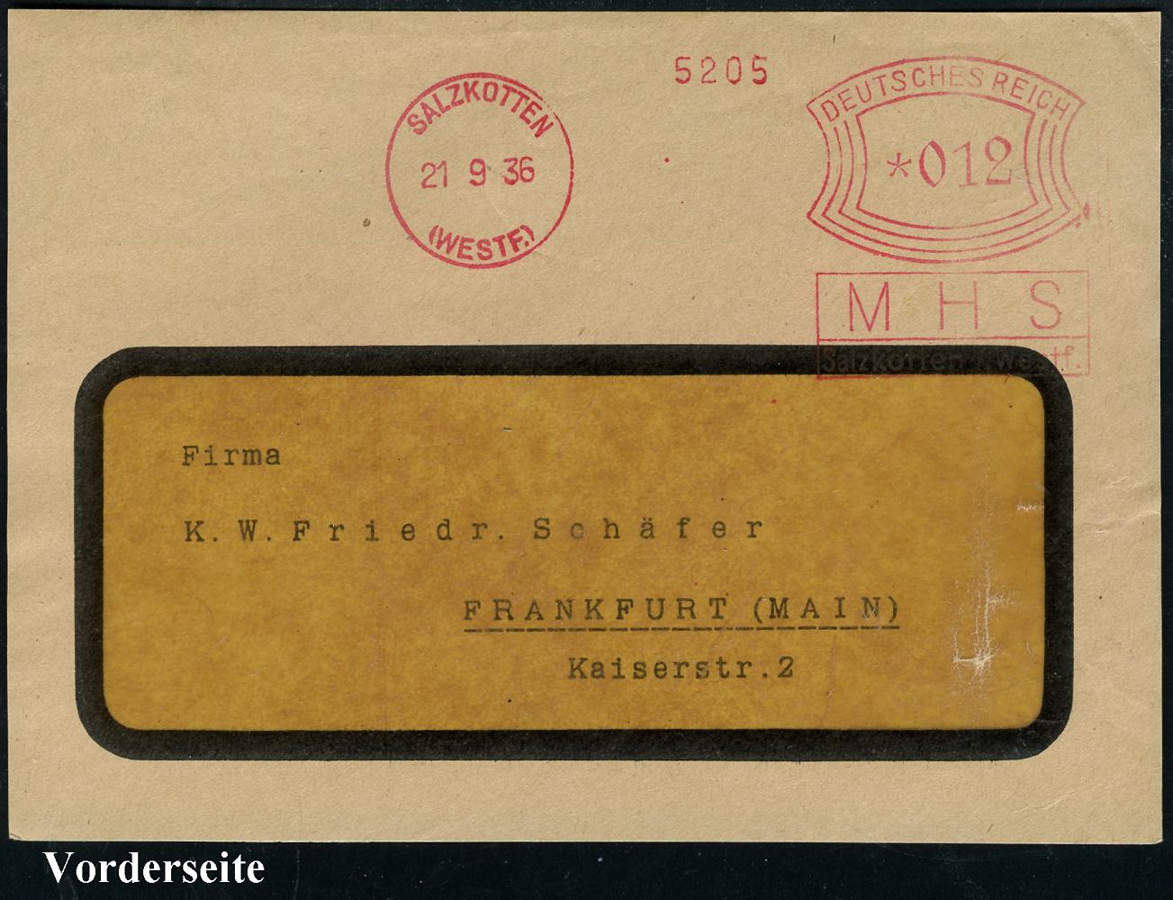8361 | 14 € | PL-Raum 47.. (ohne Hamm) : SALZKOTTEN/ (WESTF.)/ M H S 1936 (21.9.) AFS Francotyp "Bogenrechteck" = Fa. Deutsche Gerätebau AG, Werk Martini-Hüneke Salzkotten, Bedarfs-Vorderseite, vergl. Kat.-Nr. 8362-63 (Dü.E-1Ah) | ![]() | |
