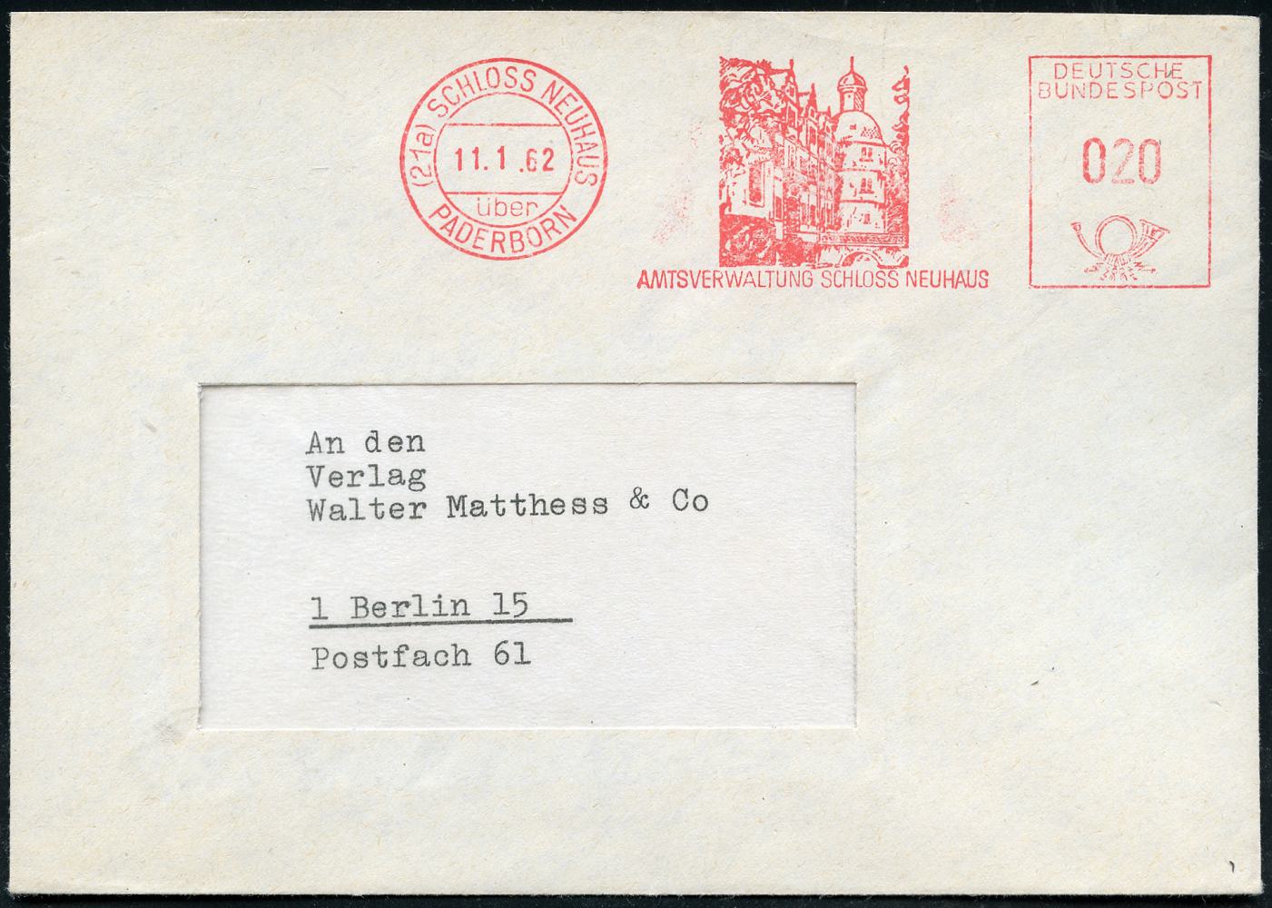 8364 | 15 € | PL-Raum 47.. (ohne Hamm) : (21a) SCHLOSS NEUHAUS/ über/ PADERBORN/ AMTSVERWALTUNG.. 1962 (11.1.) AFS Francotyp = PSt.I-Typ noch mit alter PLZ (Schloß) klar gest. Fern-Bf. (Dü.E-23CO) | ![]() | |