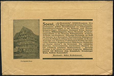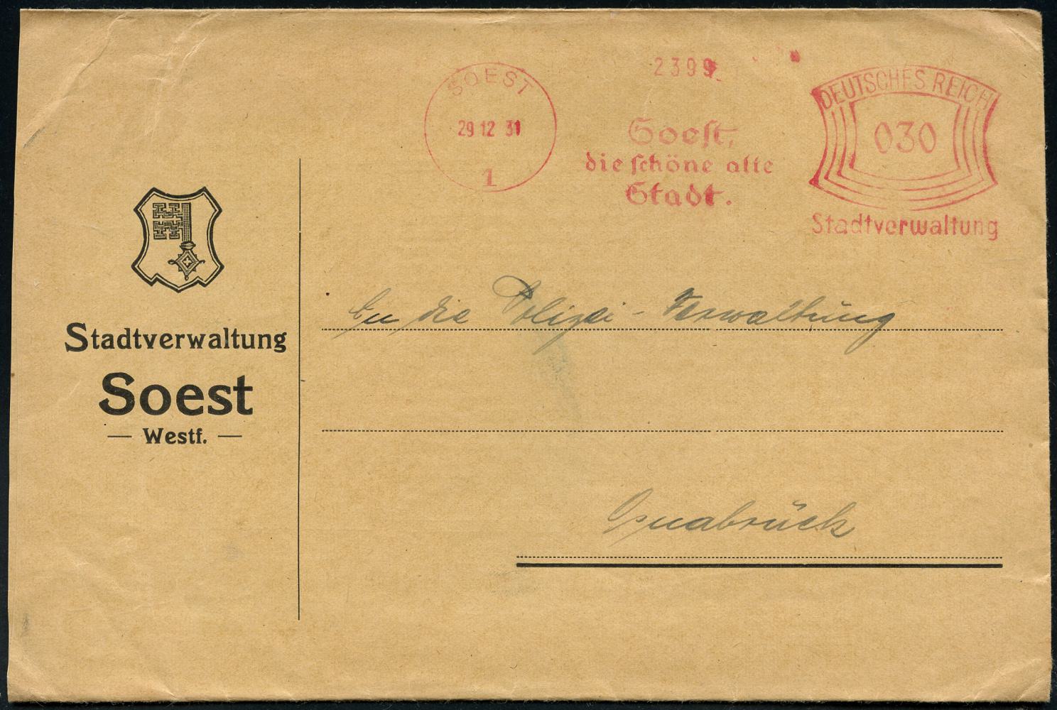 8370 | 20 € | PL-Raum 47.. (ohne Hamm) : SOEST/ 1/ ..die schöne alte/ Stadt/ Stadtverwaltung 1931 (29.12.) AFS Francotyp "Bogenrechteck" 030 Pf. auf Kommunal-Bf. (Stadtwappen) rs. Illustration: Freiligrath-Haus + Text n. Osnabrück, seltenes Porto! (Dü.E-1CEh) | ![]() ![]() | |