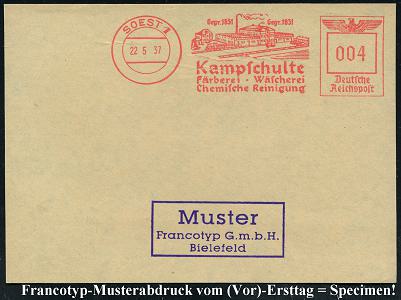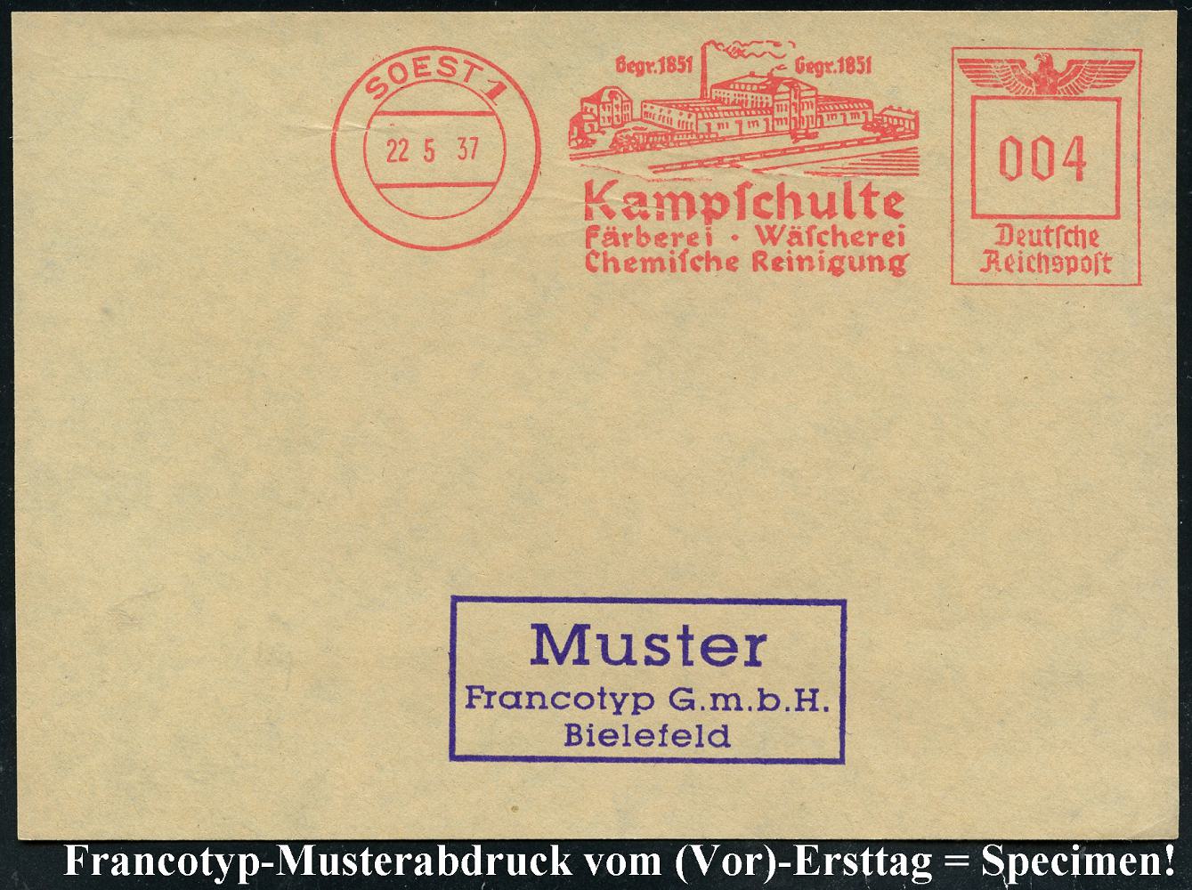 8372 | 35 € | PL-Raum 47.. (ohne Hamm) : SOEST 1/ ..Kampschulte/ Färberei-Wäscherei/ Chemische Reinigung 1937 (22.5.) AFS-Musterabdruck Francotyp "Reichsadler" (Fabrikanlage) glasklar gest. Francotyp-Musterblatt vom (Vor)-Ersttag !, selten! (Dü.E-5CGo) | ![]() ![]() | |