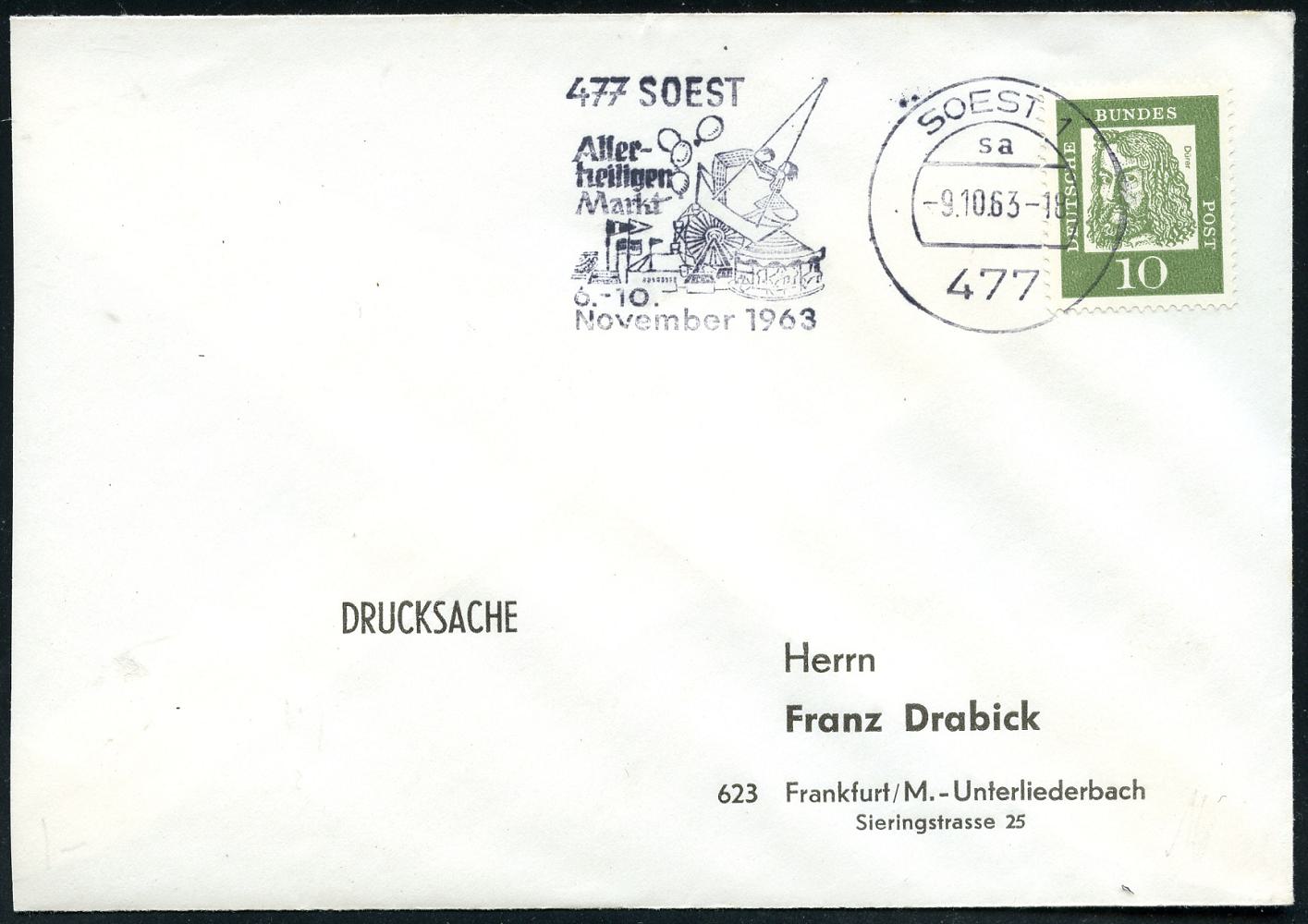 8374 | 14 € | PL-Raum 47.. (ohne Hamm) : 477 SOEST 1/ sa/ Aller-/ heiligen/ Markt.. 1963 (9.10.) MWSt = Schiffschaukel, Riesenrad, Karussel (Luftballons etc.) klar gest. Fern-Bf. (Bo.16 A) | ![]() | |