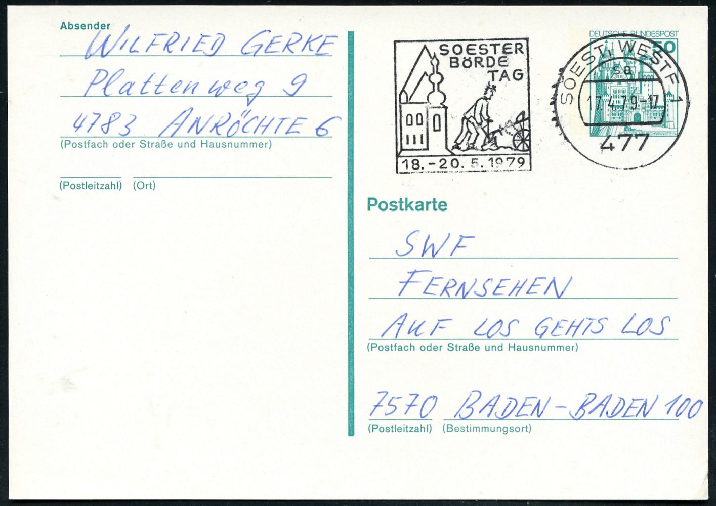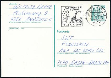 8377 | 6 € | PL-Raum 47.. (ohne Hamm) : 477 SOEST,WESTF 1/ sa/ SOESTER/ BÖRDE/ TAG.. 1979 (17.4.) MWSt (Bauer mit Pflug etc.) Bedarfs-Kt. | ![]() | |