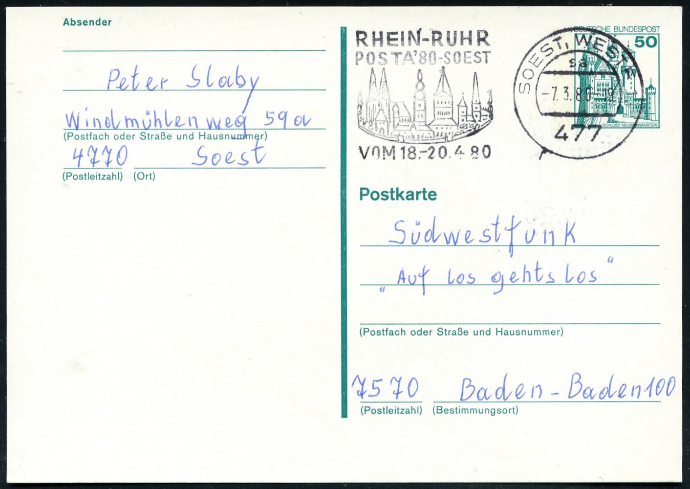 8378 | 6 € | PL-Raum 47.. (ohne Hamm) : 477 SOEST,WESTF 1/ sa/ RHEIN-RUHR/ POSTA´80.. 1980 (7.3.) MWSt (Stadtbild) Bedarfs-Kt. | ![]() | |