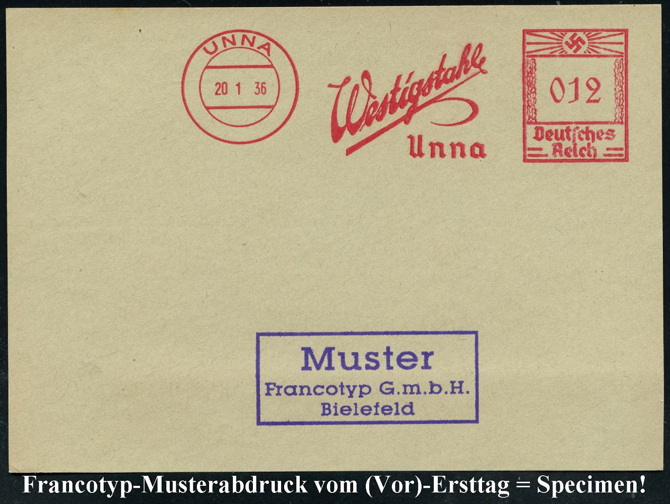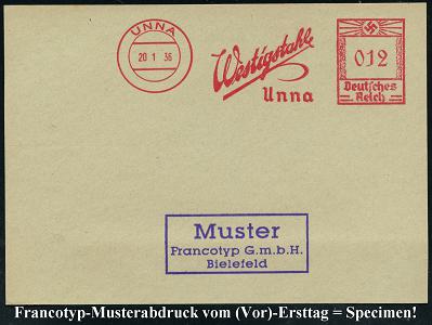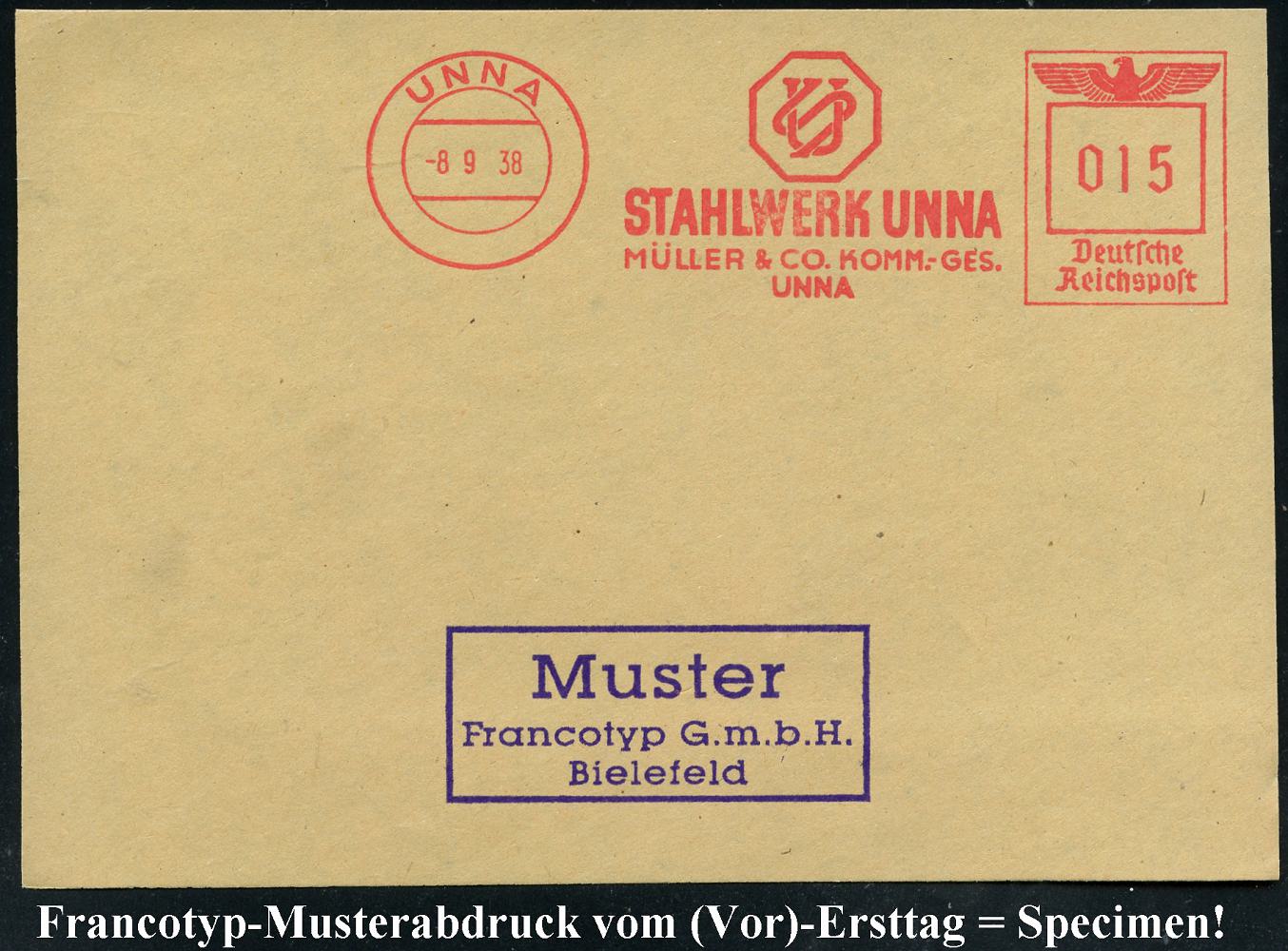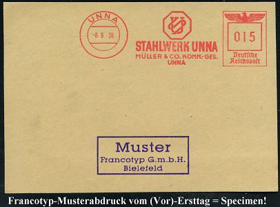 8386 | 35 € | PL-Raum 47.. (ohne Hamm) : UNNA/ STAHLWERKE UNNA/ MÜLLER & CO.. 1938 (8.9.) AFS-Musterabdruck Francotyp "Reichsadler" (Monogr.-Logo) glasklar gest. Francotyp-Musterblatt vom (Vor)-Ersttag !, selten! (Dü.E-5CGo) | ![]() ![]() | |