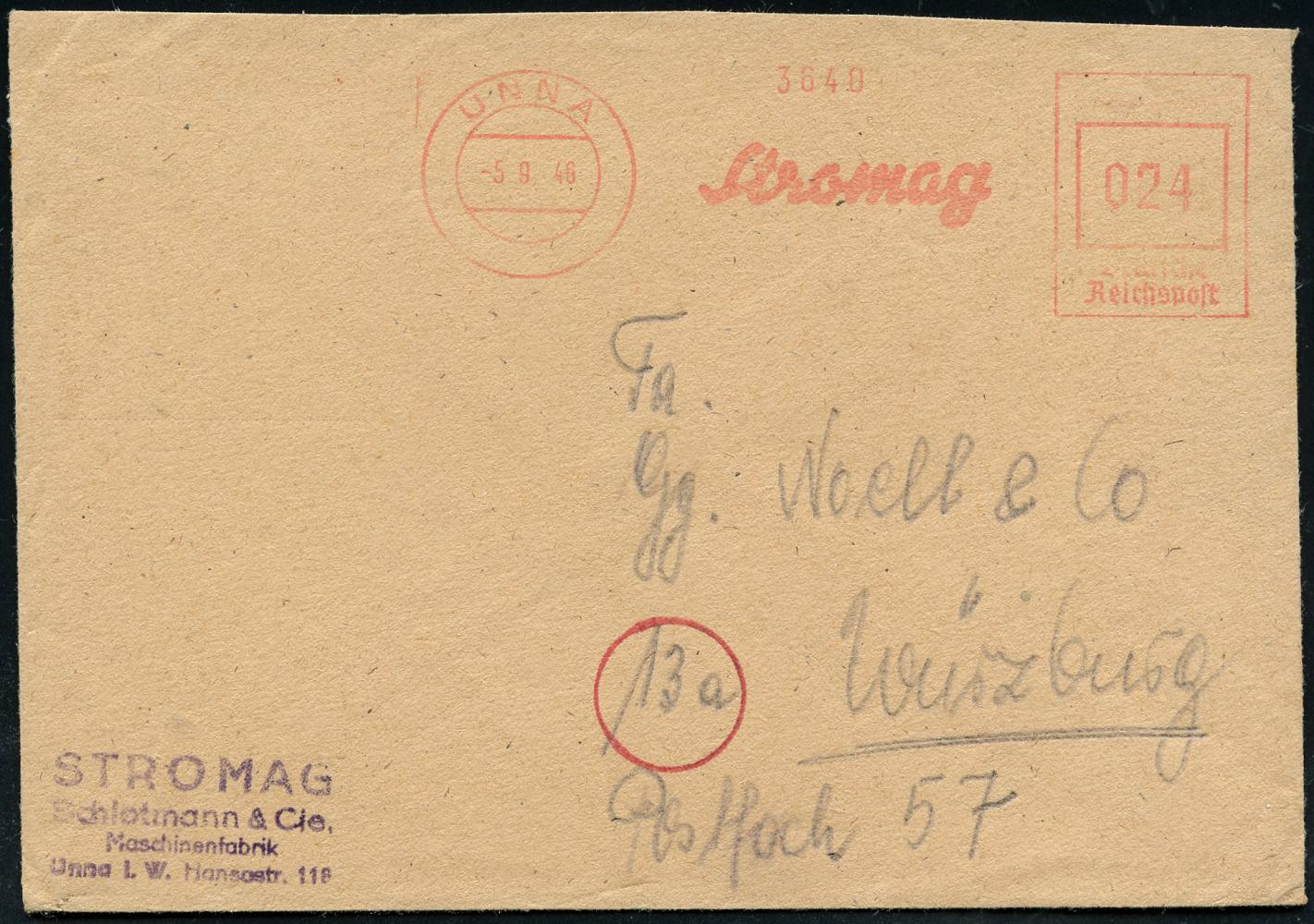 8387 | 25 € | PL-Raum 47.. (ohne Hamm) : UNNA/ Stromag 1946 (5.9.) aptierter AFS Francotyp "Reichsadler" = entfernt = Notmaßnahme! + viol. Abs.-4L: STROMAG, Schlotmann & Cie,, Maschinenfabrik.., Fern-Bf. (Dü.E-13 J-129h) | ![]() ![]() | |