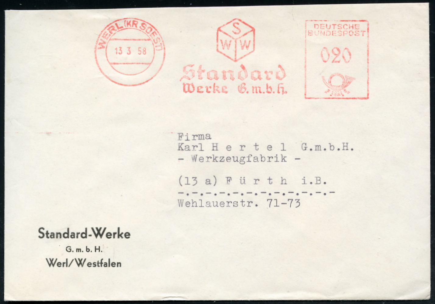 8396 | 12 € | PL-Raum 47.. (ohne Hamm) : WERL (KR SOEST)/ SWW/ Standard/ Werke GmbH 1958 (13.3.) AFS Francotyp "Posthorn" (Monogr.-Logo) Firmen-Bf. (Dü.E-23CEo) | ![]() | |