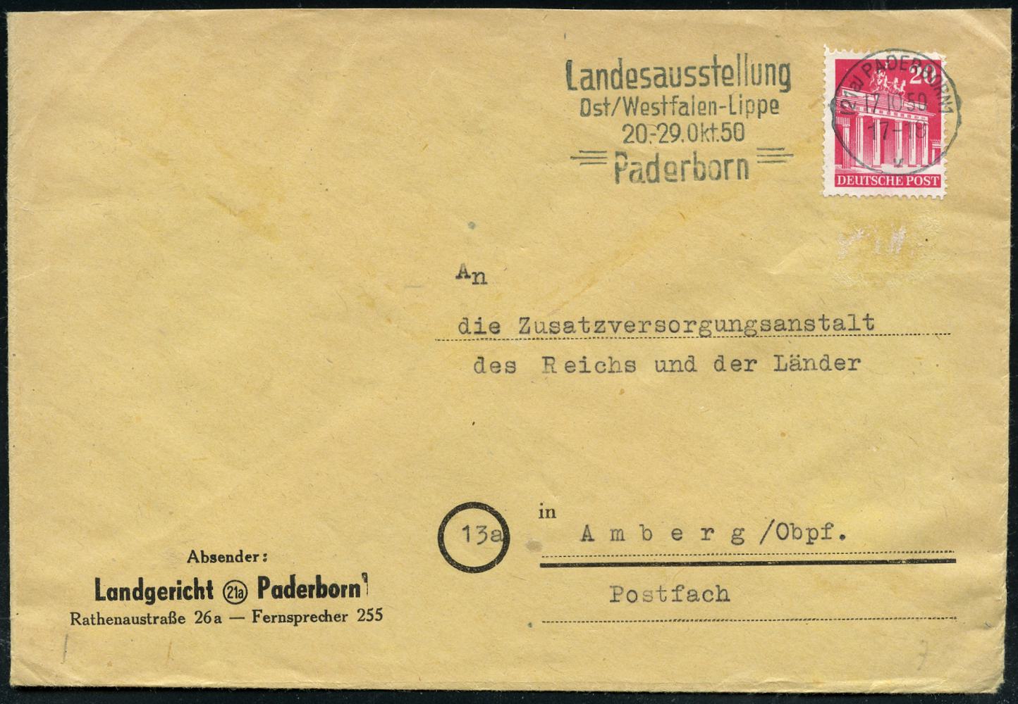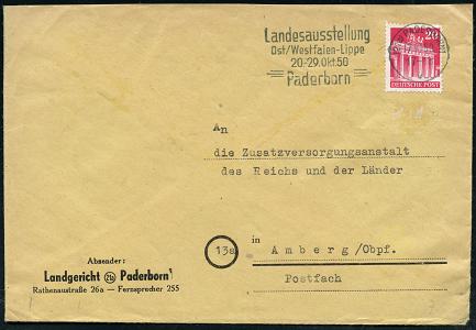 8346 | 15 € | PL-Raum 47.. (ohne Hamm) : (21a) PADERBORN 1/ v/ Landesausstellung/ Ost-Westfalen-Lippe/ 20.-29.Okt. 1950 (17.10.) MWSt auf EF 20 Pf. Bauten, eng gez. klar auf Dienst-Bf.: Landgericht.. (Bo.7 A) | ![]() | |