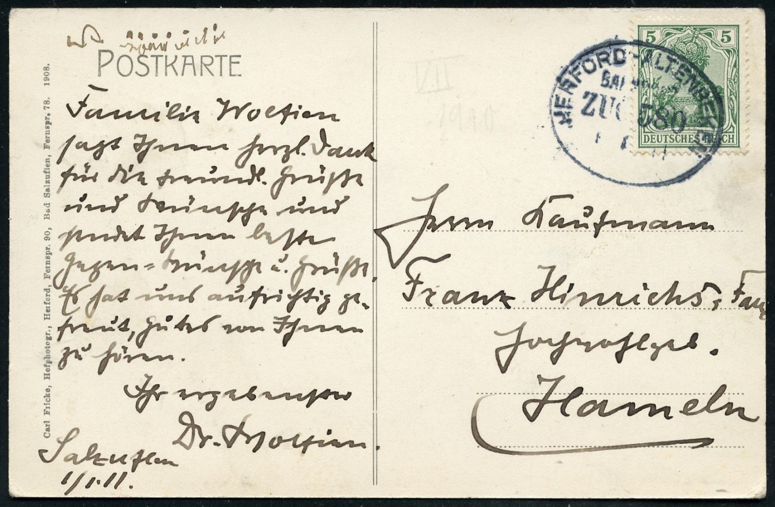 8279 | 15 € | PL-Raum 47.. (ohne Hamm) : HERFORD-ALTENBEKEN/ BAHNPOST/ ZUG 580 1911 (1.1.) Bahn-Oval auf s/w.-Foto-AFoto-k.: Bad Salzuflen, Salzepartie n. Hameln, Bedarf (Mi.85 I) | ![]() ![]() | |