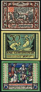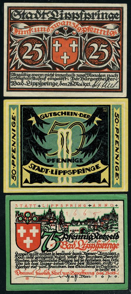 8283 | 25 € | PL-Raum 47.. (ohne Hamm) : Bad Lippspringe 1921 3 verschied. Infla-Notgeldscheine 25 Pf., 50 Pf. u. 75 Pf. in "rustikalem Naturalismus" (25 Pf. Bauer, 75 Pf. Karl d.Große/Sachsentaufe) 50 Pf. Expressionismus-Design, sign. "J D", 3 Belege | ![]() ![]() | |