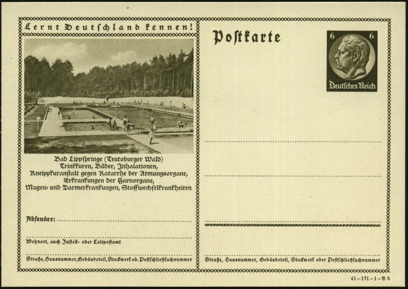 8285 | 10 € | PL-Raum 47.. (ohne Hamm) : Bad Lippspringe 1941 6 Pf BiP Hindenbg., braun: Schwimmbad (Freibad) u. Kneipp-Becken, ungebr. (Mi.P 236/41-171-B 5) | ![]() | |