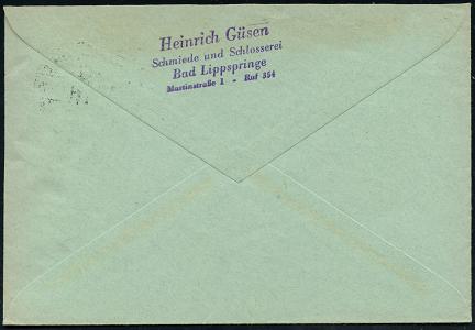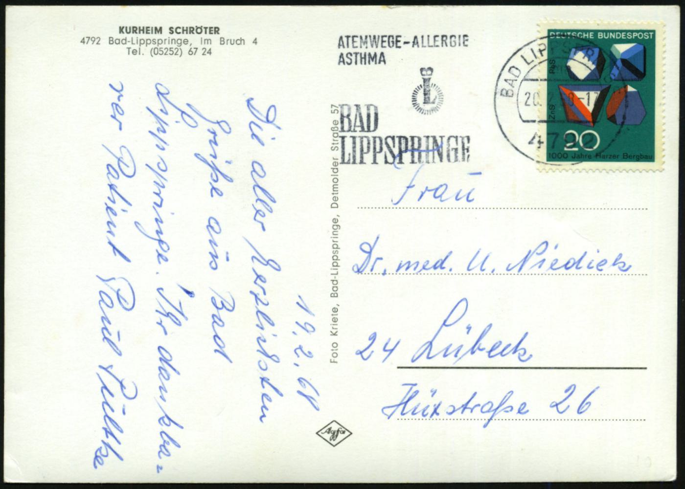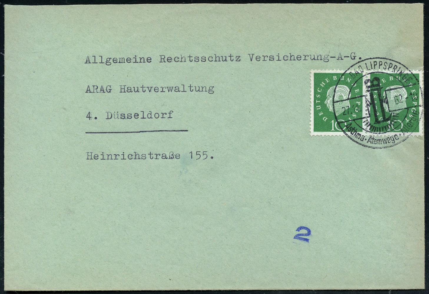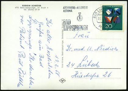 8290 | 12 € | PL-Raum 47.. (ohne Hamm) : BAD LIPPSPRINGE/ Asthma-Atemwege-Allergie 1962 (27.11.) aptierter HWSt = alte PLGZ entfernt , klar gest. Firmen-Fern-Bf. (Bo.8 aptiert, nur 1962 verwendet) | ![]() ![]() | |