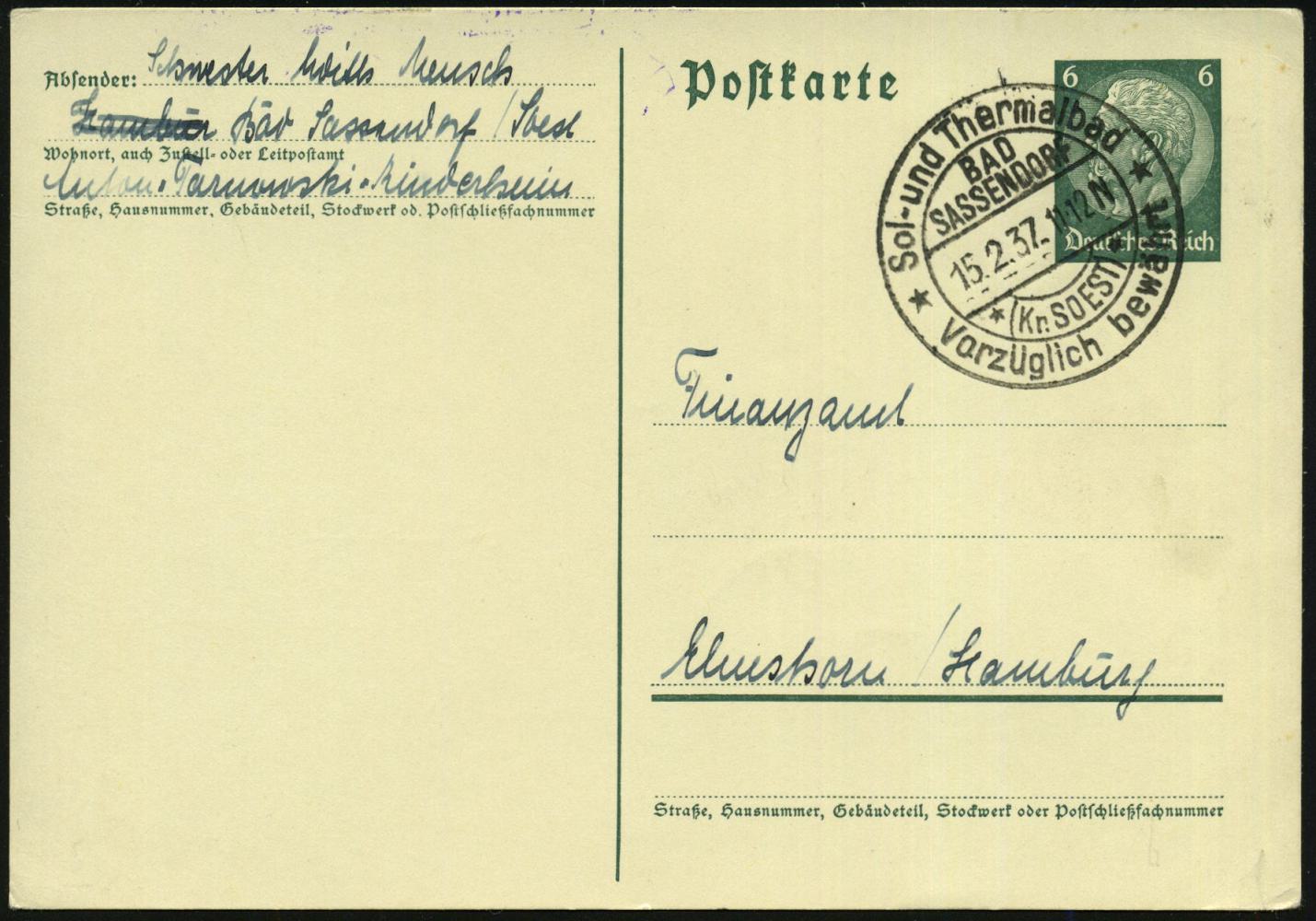 8293 | 18 € | PL-Raum 47.. (ohne Hamm) : BAD/ SASSENDORF/ *(Kr.SOEST)/ Sol-u.Thermalbad.. 1937 (15.2.) HWSt klar auf Bedarfs-Kt. (Bo.1 ,Bochmann 1937 unbekannt! = Lj.!) | ![]() | |