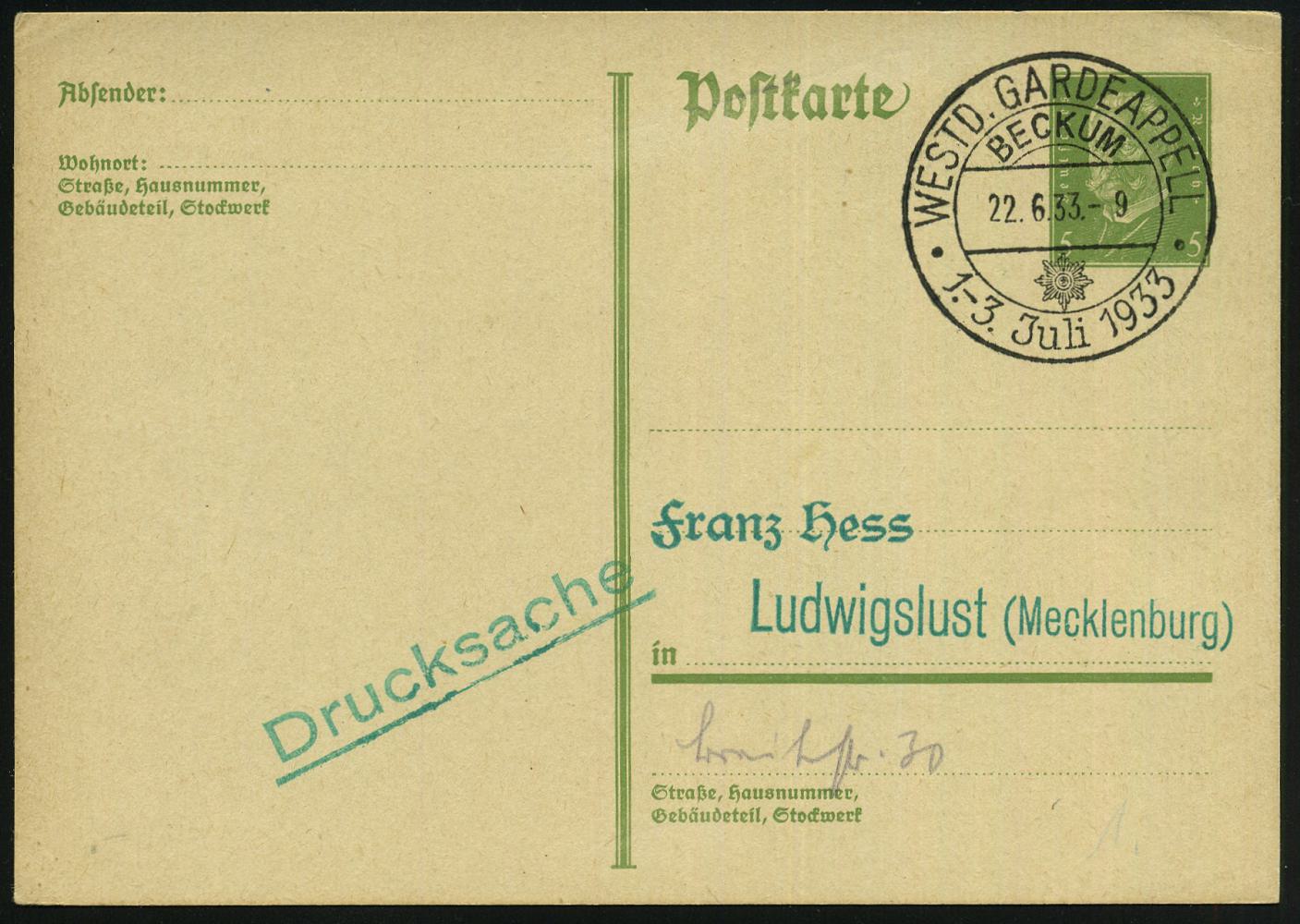 8296 | 18 € | PL-Raum 47.. (ohne Hamm) : BECKUM/ WESTD.GARDEAPPELL/ 1.-3.Juli 1933 (22.6.) HWSt = Gardestern (auch Orden) glasklar gest. Inl.-Karte (Bo.1, nur 1933 bis zum 3. Juli verwendet) | ![]() | |