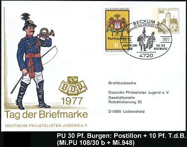8302 | 8 € | PL-Raum 47.. (ohne Hamm) : BECKUM 2/ D.Ph.J.E.V./ TAG DER BRIEFMARKE 1977 (30.10.) SSt auf PU 30 Pf "Tag der Briefmarke" (Postillon) mit gedruckter Adr. (Philat.Jugend) + T.d.B. 10 Pf. (Mi. 948) Inl.-Bf. (Mi. PU 108/30 b) | ![]() | |