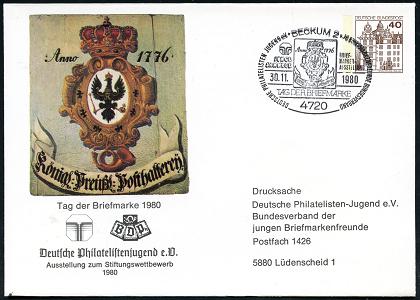 8303 | 8 € | PL-Raum 47.. (ohne Hamm) : 4720 BECKUM 2/ TAG DER BRIEFMARKE 1980 (30.11.) SSt (Postschild) auf motivgl. PU 40 Pf. Tag der Briefmarke mit gedruckter Adr. (Philat.Jugend) Inl.-Bf. (Mi. PU 111/37) | ![]() | |
