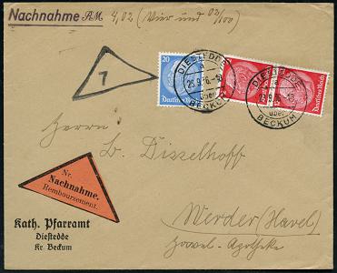 8309 | 20 € | PL-Raum 47.. (ohne Hamm) : DIESTEDDE/ a/ über/ BECKUM 1936 (28.9.) 2K -Steg = PSt.I , 2x auf satzreiner Hindenbg.-Frankatur 44 Pf., Kirchen-Dienst-Bf.: Kath. Pfarramt Diestedde, klar gest. Inl.-NN-Bf., seltene Portostufe (Mi.2x 519, 521) | ![]() | |