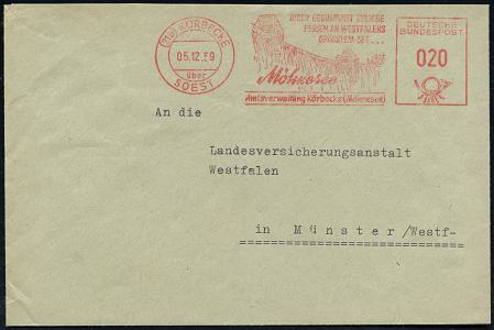 8315 | 16 € | PL-Raum 47.. (ohne Hamm) : (21b) KÖRBECKE/ über/ SOEST/ ..Möhnesee/ Amtsverwaltung Körbecke 1959 (5.12.) AFS Francotyp = PSt.I-Typ = Möhne-Talsperre , klar gest. Kommunal-Bf., schönes Motiv!, die Möhnetalsperre wurde bei einem brit. Terror-Luftangriff 1943 zerstört, offiz. 1579 Tote, darunter 1020 Zwangsarbeiter u. Kriegsgef. (Dü.E-23CO) | ![]() | |