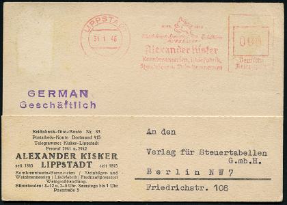 8326 | 20 € | PL-Raum 47.. (ohne Hamm) : LIPPSTADT/ ..Alexander Kister/ Kornbrennereien,Likörfabrik/ Steinhäger,Wein-Brennereien 1946 (31.1.) seltener, aptierter AFS Francotyp "Reichsadler" = entfernt = Notmaßnahme! (Zentaur) zeitbedingt etw. schwach, Firmenkt. n. Ost-Berlin (Dü.E-13 J-129o) | ![]() | |