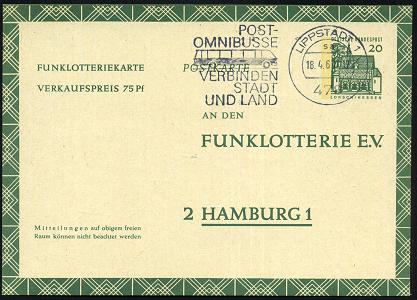 8330 | 14 € | PL-Raum 47.. (ohne Hamm) : 478 LIPPSTADT 1/ sa/ POST-/ OMNIBUSSE/ VERBINDEN/ STADT/ U.LAND 1969 (18.4.) MWSt (Omnibus) auf Funllotterie-FP 20 Pf. (Mi.FP 12) seltene Verwendung! (Bo.S 1192 A) | ![]() ![]() | |