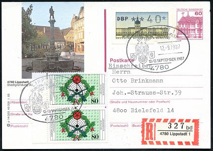 8331 | 18 € | PL-Raum 47.. (ohne Hamm) : 4780 LIPPSTADT 1/ EUROPA-SCHÜTZENFEST 1987 (12.9.) SSt auf 2x 80 Pf. Europa-Schützenfest (2x Mi. 1330 u.a.) + RZ: 4780 Lippstadt 1/b d, klar gest. ortsgleicher BiP 60 Pf. Burgen: 4780 Lippstadt.. (Brunnen) Inl.-R-Karte, seltene Kombination! (Mi.P 236) | ![]() | |