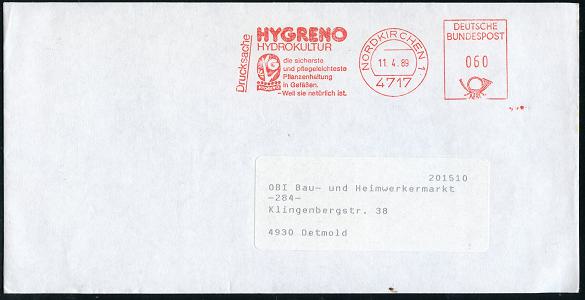 8336 | 12 € | PL-Raum 47.. (ohne Hamm) : 4717 NORDKIRCHEN 1/ HYGRENO/ HYDROKULTUR/ ..Pflanzenhaltung/ in Gefäßen.. 1989 (11.4.) AFS Postalia mit Zusatz "Drucksache" (Logo) klar gest. Fern-Bf. (Dü.E-26 B) | ![]() | |