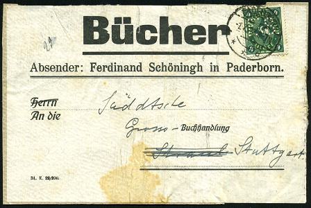 8341 | 15 € | PL-Raum 47.. (ohne Hamm) : PADERBORN/ **d 1922 (1.7.) 1K-Brücke auf EF 4 Pf. Posthorn, grün mit Firmenlochung: F S = F erdinand Schöningh (Bücher), Adreßzettel (oben Riß geschl. u. Fleck) n. Stuttgart (Mi.193 EF, Perfin) | ![]() | |