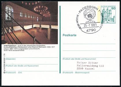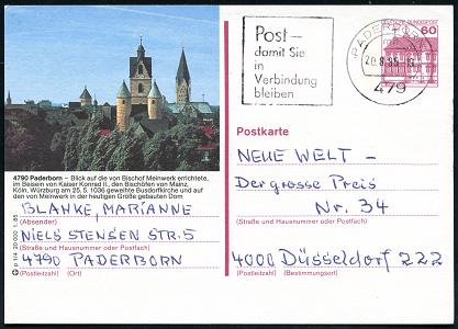 8356 | 15 € | PL-Raum 47.. (ohne Hamm) : 4790 PADERBORN 1/ mh/ Post-/ damit Sie/ in/ Verbindung/ bleiben 1985 (20.8.) MWSt auf ortsgleicher 60 Pf. BiP Burgen: Busdorfkirche..im Beisein v.Kaiser Konrad II...1036 geweiht.. Bedarf, seltene Kombination! (Mi.P 138) | ![]() | |
