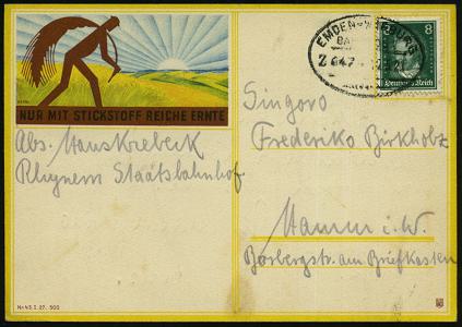 8359 | 18 € | PL-Raum 47.. (ohne Hamm) : Rhynern 1927 (12.5.) Color-Künstler-Reklame-Kt.: NUR MIT STICKSTOFF REICHE ERNTE (sing. ARPKE) mit Bahn-Oval (EMDEN-HAMBURG, teils etw. udeutl.) Text in Esperanto !, Fernkt. n. Hamm (Mi.389) | ![]() ![]() | |