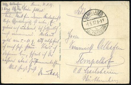 8366 | 12 € | PL-Raum 47.. (ohne Hamm) : SENNELAGER/ b/ (Kr.PADERBORN) 1917 (23.7.) 1K-Brücke + viol. 2K-HdN: Lesesaal Offiz.-Asp.-Lehrk. Sennelager + hs. Abs., s/w.-Feldpost-Ak.: Sennelager Staumühle (Eckbugspur) n. Öhringen | ![]() ![]() | |