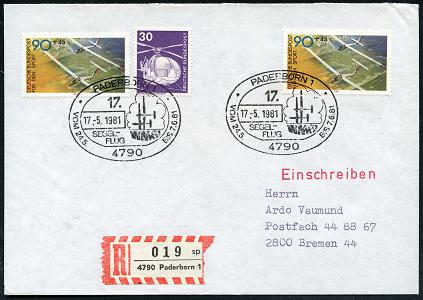 8354 | 20 € | PL-Raum 47.. (ohne Hamm) : 4790 PADERBORN 1/ 17./ SEGEL-/ FLUG WM 81 1981 (17.5.) SSt auf 2x 90 Pf.+ 45 Pf. Segelflugsport (Mi.1095 2x u.a.) + Sonder-RZ: 4790 Paderborn 1/ s p = S(onder)-P(ostamt) , klar gest. Inl.-R-Bf., schöne Kombination! (Bo.70) | ![]() | |
