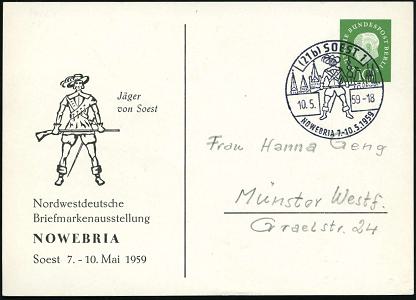 8373 | 16 € | PL-Raum 47.. (ohne Hamm) : (21b) SOEST 1/ NOWEBRIA 1959 (10.5.) SSt = Musketier auf motivgl. PP 10 Pf. Heuss III: Jäger v.Soest (Landsknecht mit Muskete) Bedarf (Mi.PP 21/1) dekorativer Beleg (Bo.11) | ![]() | |