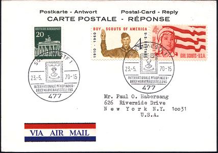 8376 | 18 € | PL-Raum 47.. (ohne Hamm) : 477 SOEST,WESTF 1/ INT.PFADFINDER-/ BRIEFM.AUSSTELLUNG 1970 (23.5.) SSt ( = Baden-Powell) auf MiF Österreich 1 S. "50 Jahre Pfadfinder" (Mi.1122 u.a.) + 20 Pf. Brandenbg. Tor, zulässige Retour- Ausl.-Antwortkt. n. Österreich, Unikat! (Bo.37) | ![]() | |