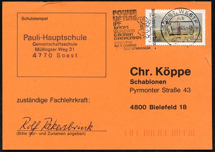 8380 | 10 € | PL-Raum 47.. (ohne Hamm) : 4770 SOEST,WESTF1/ sd/ POWER/ LIFTING/ IPF/ JUNIORS/ WORLD AND/ EUROPEAN/ CHAMP. 1985 (23.8.) MWSt (Gewichtheber) kommunale Dienst-Kt. (Schule) n. Bielefeld (Bo.93 A) | ![]() | |