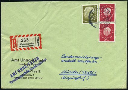8391 | 14 € | PL-Raum 47.. (ohne Hamm) : (21 b) WEDDINGHOFEN/ a/ über/ KAMEN (WESTF) 1960 2K-Steg = PSt.I + RZ: Weddinghofen/üb Kamen (Westf) , Kommunal-R-Bf. Amt Unna.. überstempelt mit Verwaltungsstelle Weddinghofen n. Münster | ![]() | |