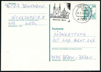 8397 | 6 € | PL-Raum 47.. (ohne Hamm) : 4760 WERL 1/ sr/ Basilika Werl 1979 (23.7.) MWSt (Basilika) Bedarf (Bo.15 A I ,Erstjahr) | ![]() | |