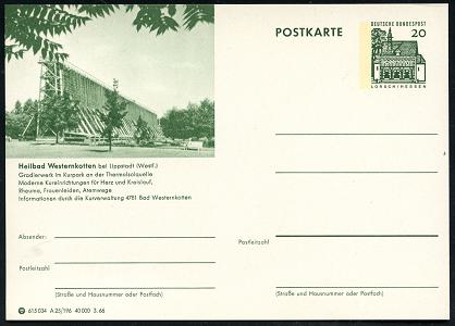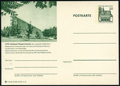 8398 | 10 € | PL-Raum 47.. (ohne Hamm) : 4781 Westernkotten 1966/67 2 verschied. BiP 20 Pf. Lorsch, grün: Gradierwerk.. an der Thermalsolquelle (Einzelverkauf möglich: je 6.- EUR) je ungebr., 2 Belege (Mi.P 89/A 25, P 91/B 9) | ![]() ![]() | |
