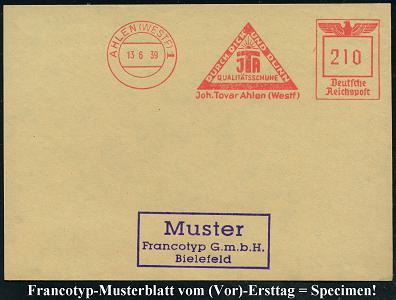 8276 | 35 € | PL-Raum 47.. (ohne Hamm) : AHLEN (WESTF) 1/ DURCH DICK UND DÜNN/ JTA/ QUALITÄTSSCHUHE/ Joh.Tover.. 1939 (13.6.) AFS-Musterabdruck Francotyp "Reichsadler" (Monogr.-Logo) glasklar gest. Francotyp-Musterblatt vom (Vor)-Ersttag !, selten! (Dü.E-5CGo) | ![]() ![]() | |
