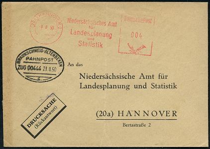 8280 | 15 € | PL-Raum 47.. (ohne Hamm) : BRAUNSCHWEIG-ALTENBEKEN/ BAHNPOST/ ZUG 00444/ c 1950 (23.8.) Bahn-Oval + AFS Postalia: (20 a) HANNOVER 2/ Niedersächs. Amt/für/Landesplanung/und/Statistik (gefalteter Antwort-Bf.) vorausfrankierter Dienst-Bf. n. Hannover (Dü.E-20B) | ![]() | |