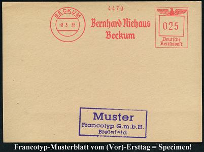 8297 | 35 € | PL-Raum 47.. (ohne Hamm) : BECKUM/ Bernhard Niehaus.. 1938 (8.3.) AFS-Musterabdruck "Reichsadler" , glasklar gest. Francotyp-Musterblatt vom (Vor)-Ersttag !, selten! (Dü.E-5CGh) | ![]() ![]() | |